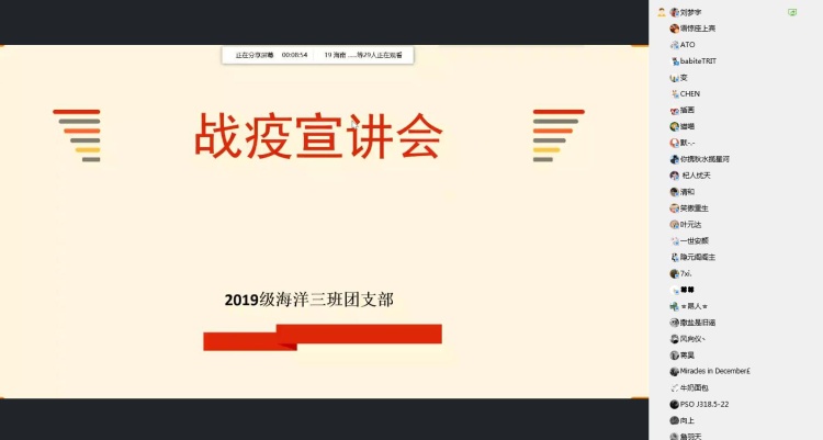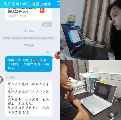2020年5月23日20:00,永利yl23411官网2019级海洋科学三班团支部“绽放战疫青春”主题团日活动隆重举办。中国水电十三局医院党委委员王炳花院长、永利yl23411官网团委书记安杰晶老师、本科生辅导员金颖、19级海洋三班学生参与此次活动。会议由团支书刘梦宇主持。