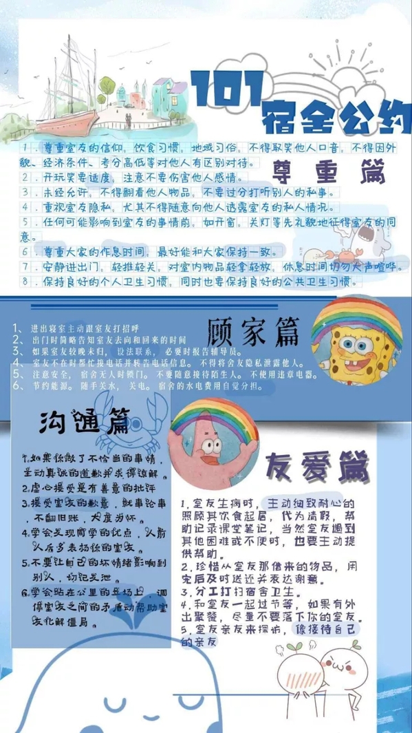 在9月13日至9月19日,21级萌新以宿舍为单位,线上商讨并设计宿舍公约,有手绘也有ps设计。最终由各部门部长以及老师们共同评选出了一等奖作品1个,二等奖作品2个,三等奖作品3个,优秀奖作品若干。
