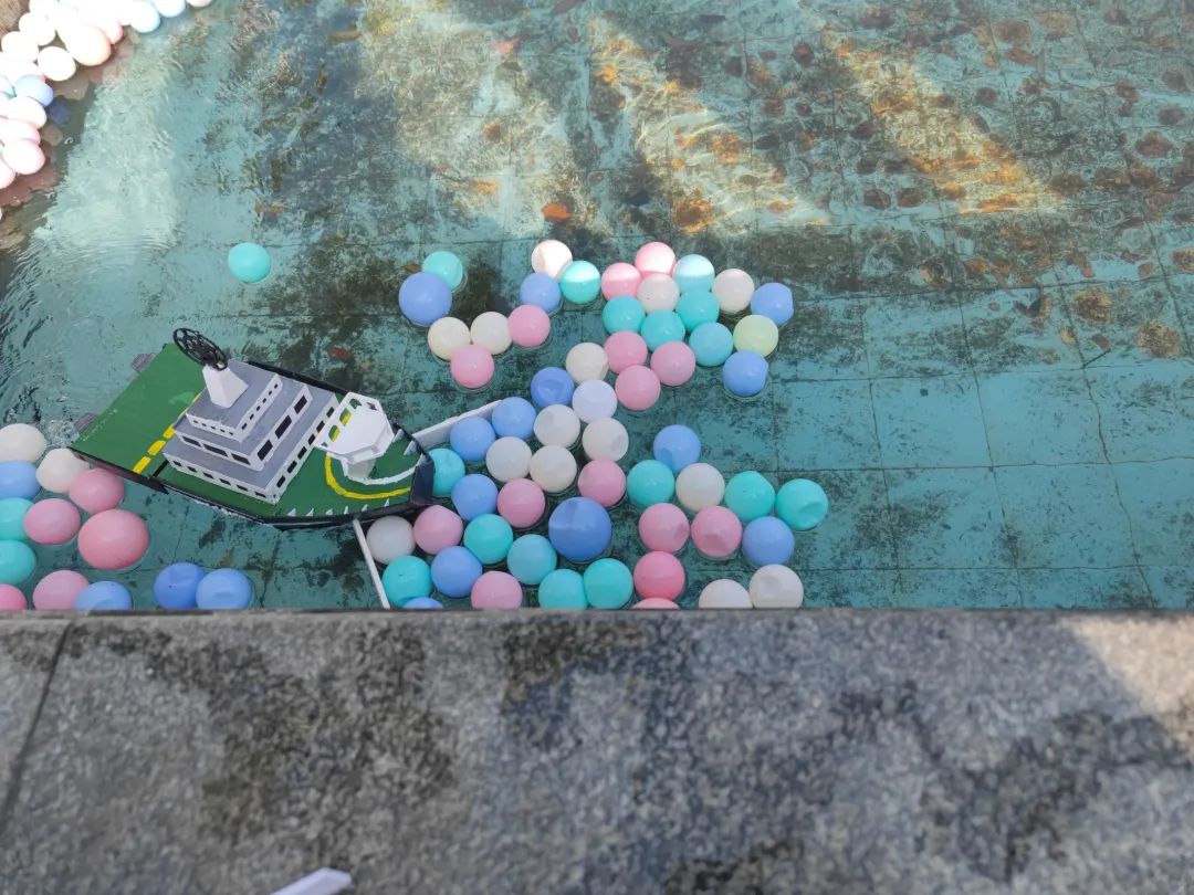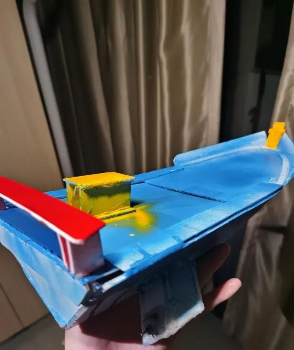 设计理念:本船整体采用单体流线型结构,以船速快、稳定性高、核载量大为主要目的,初赛直道竞速的结果也能证明该结构有一定优越性。船头部大体呈三方单锥形,前尖后平。底部由四张板拼接而成,呈尖角状。内部仓板上侧装有电路板和发动装置,后部装有螺旋桨外套。外部船体颜色以红黄蓝为主色,灵感来源于三原色及三色鱼。